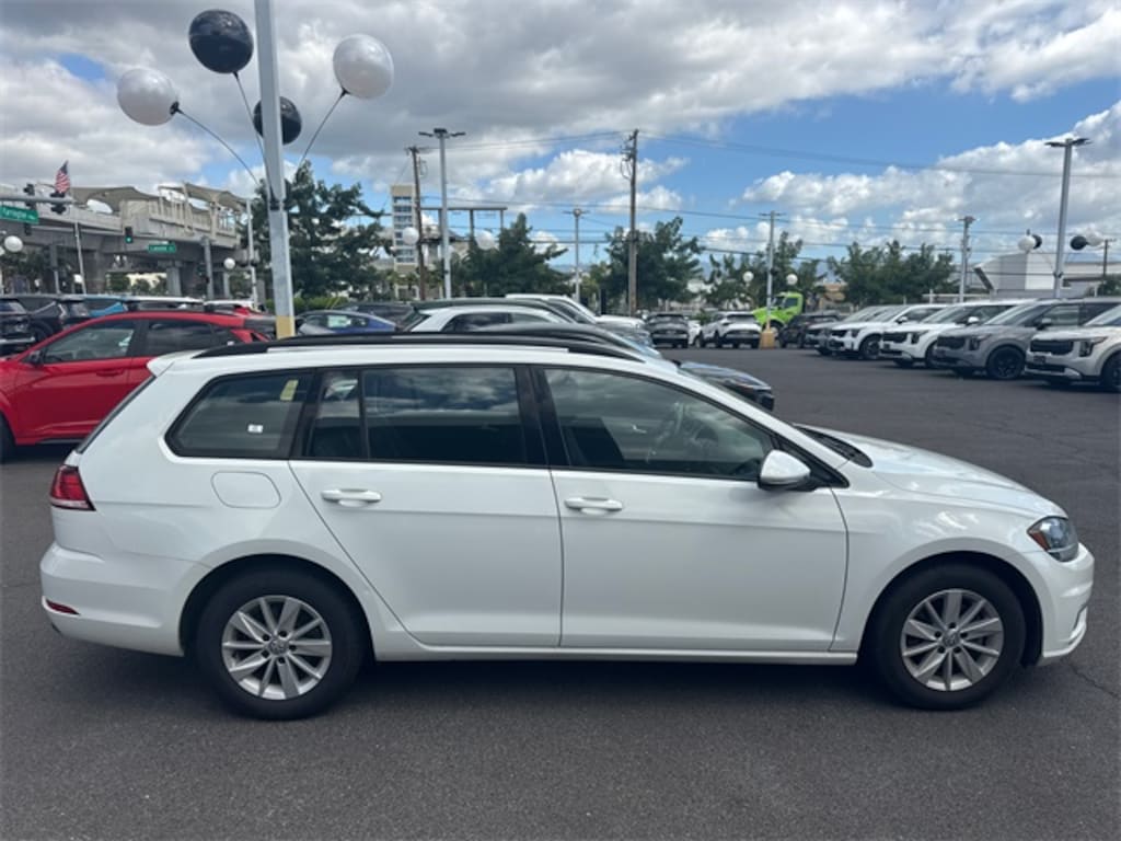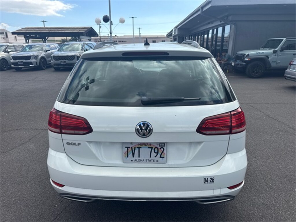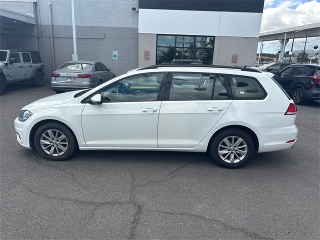 Certified. White 2019 Volkswagen Golf SportWagen S FWD 8-Speed Automatic with Tiptronic 1.4L TSI 15" Alloy Wheels, 4-Wheel Disc Brakes, 6 Speakers, ABS brakes, Air Conditioning, Alloy wheels, AM/FM radio, Anti-whiplash front head restraints, Brake assist, Bumpers: body-color, Cloth Seating Surfaces, Compass, Delay-off headlights, Driver door bin, Driver vanity mirror, Dual front impact airbags, Dual front side impact airbags, Electronic Stability Control, Exterior Parking Camera Rear, Four wheel independent suspension, Front anti-roll bar, Front Bucket Seats, Front Center Armrest, Front Comfort Seats, Front reading lights, Fully automatic headlights, Heated door mirrors, Illuminated entry, Leather Shift Knob, Leather steering wheel, Low tire pressure warning, Occupant sensing airbag, Outside temperature display, Overhead airbag, Overhead console, Panic alarm, Passenger door bin, Passenger vanity mirror, Power door mirrors, Power driver seat, Power passenger seat, Power steering, Power windows, Radio data system, Radio: Composition Color w/6.5" Touchscreen, Rain sensing wipers, Rear anti-roll bar, Rear reading lights, Rear seat center armrest, Rear window defroster, Rear window wiper, Remote keyless entry, Roof rack: rails only, Speed control, Speed-sensing steering, Speed-Sensitive Wipers, Split folding rear seat, Steering wheel mounted audio controls, Tachometer, Telescoping steering wheel, Tilt steering wheel, Traction control, Trip computer, Turn signal indicator mirrors, Variably intermittent wipers.